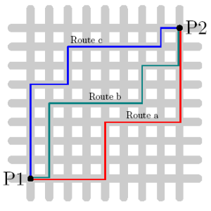 The Manhattan Distance between two points is not dependent on the route taken. This is illustrated in the figure below; the three routes, a, b and c between P1 and P2 have the same length.
