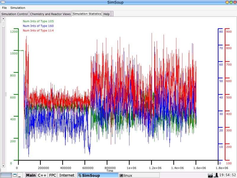 The enhanced statistics output included in SimSoup yesterday have already produced an interesting result. The plot shown below was produced by a SimSoup run with a chemical network including 200 Molecule Types and 254 Catalytic Transformations, each of which is a pair of Interaction Types (a Compound Interaction) of the following form:-