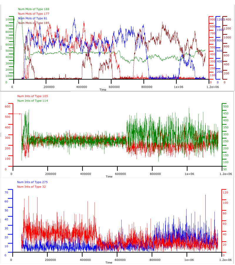 The first plot shows that the number or Molecules of a particular type can be relatively stable over long periods, and that there can then be a transition to another network state in which the number of Molecules of the type is relatively stable, but in a different region. For example, there is a transition at about time 650,000 in which the number of Molecules of Type 169 falls from a stable value of about 4000 to a lower value of about 3000. Other Molecule Types show similar meta-stable behaviour.
