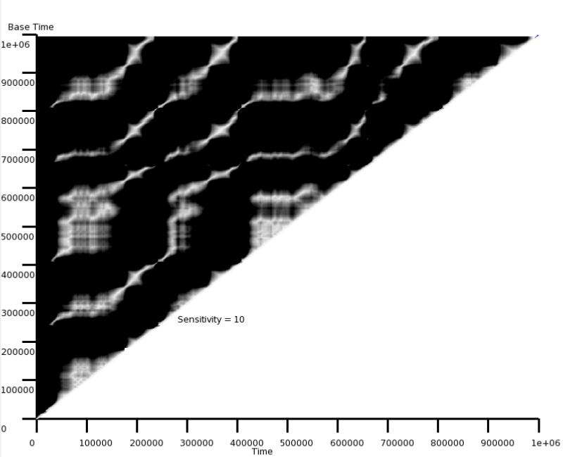 The striking diagonal pattern indicates that the Reactor Composition is behaving cyclically. Following any horizontal line across the plot, we see that most of the path is black, but that it turns white for a short period at intervals of approximately 200,000 timesteps. The white sections along the line indicate periods during which the system had (almost) the same Reactor Composition.