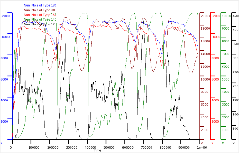 The plot below shows initial output from SimSoup using Trackers. The scenario setup was as follows:-