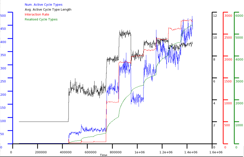 The two plots below show details of the behaviour in the Reactor. The first of the two shows rates of specific Interaction Types, and the second shows the numbers of specific Molecule Types in the Reactor as the simulation proceeds.