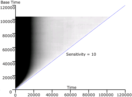 In the example plot above, the Reactor Composition is in fact in a considerable state of flux during the period up to Time = 30,000. This can be seen by focusing on the horizontals for Base Time = 30,000 and earlier (bottom left of the figure). These horizontals are black except for all but the latest Times (those that are close to the diagonal). This indicates that whatever Base Time we choose during this period, its Reactor Composition is substantially different to that for earlier times.