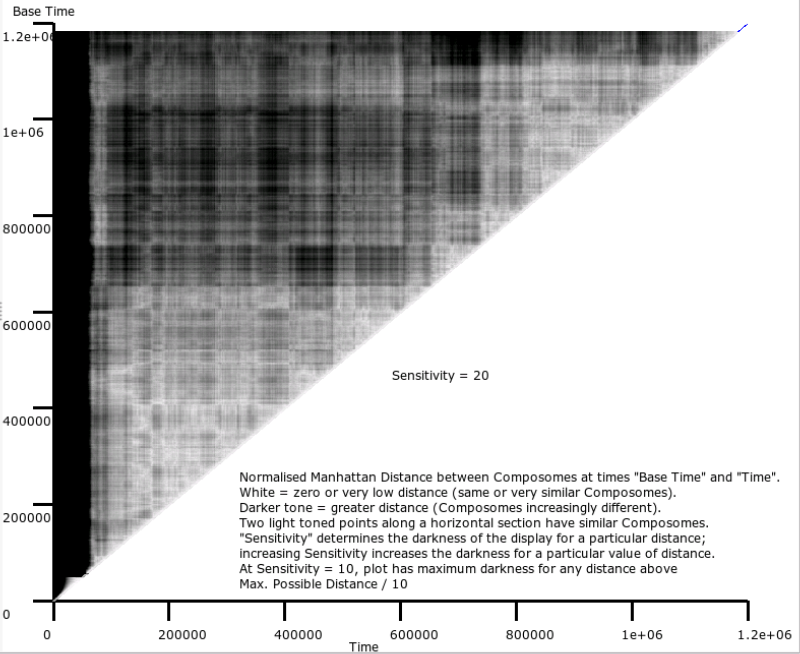 The most straightforward way to read the plot is horizontally from left to right. The point at the far right of each 'row' corresponds to the compositional makeup of the network at a point in time (the 'Base Time'). Points to the left correspond to the compositional makeup at earlier times, with the darkness of each point indicating the Manhattan Distance from the compositional makeup at the Base Time. A light coloured point therefore indicates a time at which the compositional makeup was close to that at the (later) Base Time.