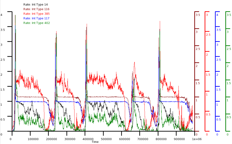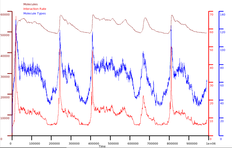 The two plots below show details of the behaviour in the Reactor. The first of the two shows rates of specific Interaction Types, and the second shows the numbers of specific Molecule Types in the Reactor as the simulation proceeds.